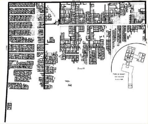 The drawings from the excavation show that Kahun was rectangular in shape ca. 384 x 335 meters - and laid out on a regular plan. A mudbrick wall was running along the three sides of the town whereas another internal one, of the same thickness, divided about one third of the area. This spatial division revealed the existence of two social classes living separately. One part of the town consisted of small houses of about four rooms, organized in rows, abutting on the side and back with each other. According to documents found, the house plans were not so fixed, but rather adjusted, throughout time, to accommodate smaller or larger families. It also seems that there were stairs leading to the roof, providing an extra room to the houses. These small houses, that were about 120 square meters in total, addressed to workers, soldiers, doorkeepers, singers, dancers and low-level scribes1 , as it is documented by the surviving texts.